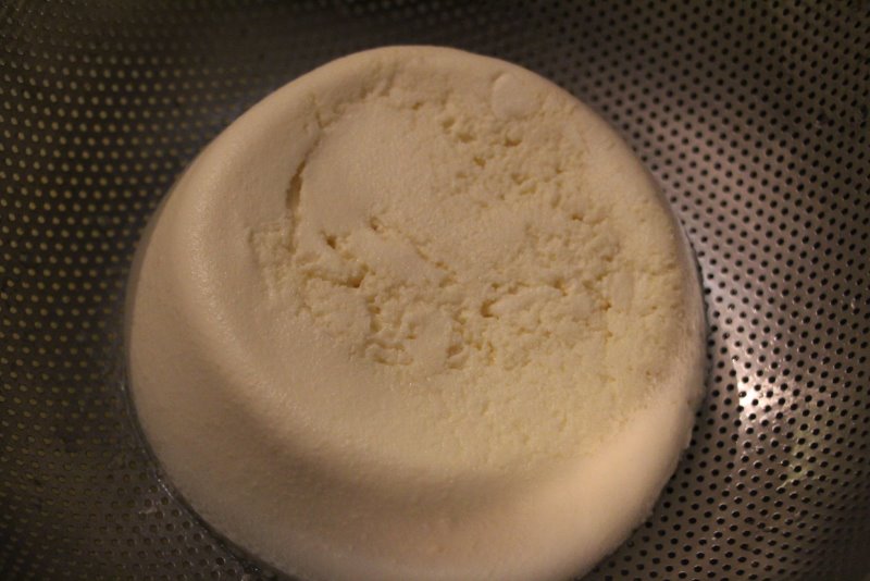 5. IMG_0444Tie the corners of the cheesecloth together, and hang over a  bowl to drain for couple of hours. I left mine in the colander to drain, and it worked fine. A shorter draining time will produce a spreadable cheese, while a longer draining time will produce more of a solid texture.